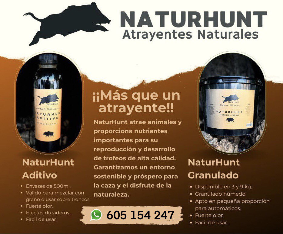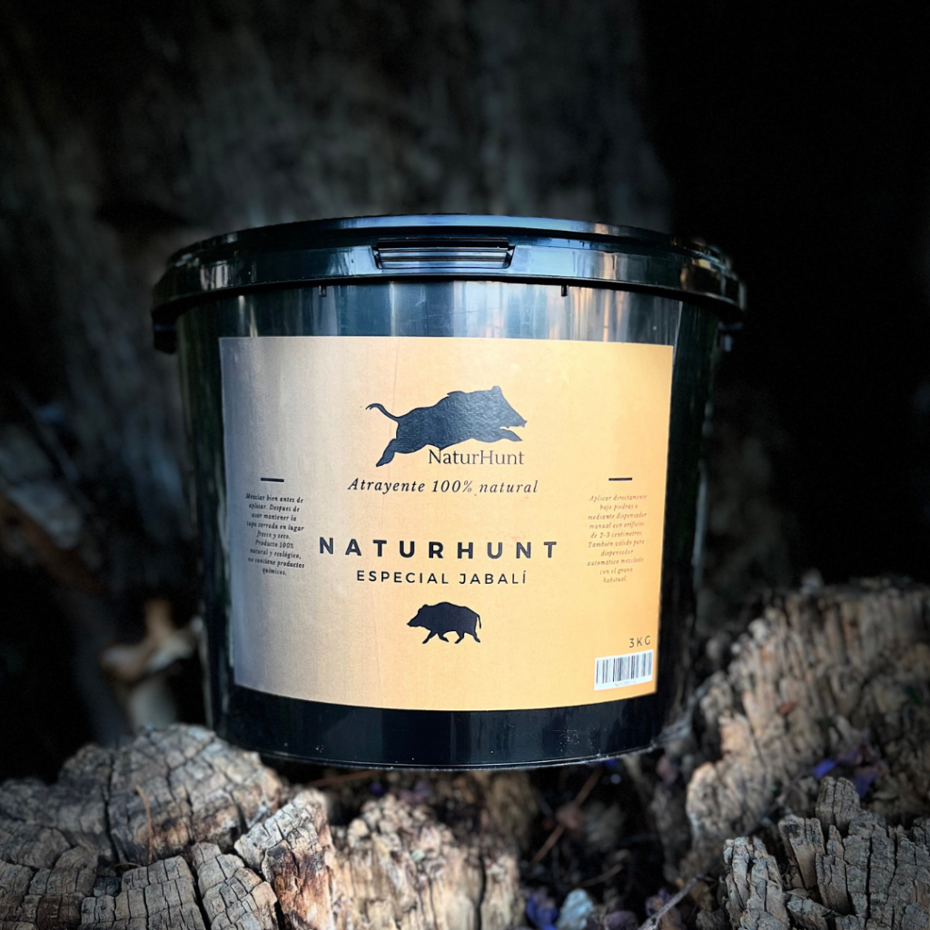 Naturhunt es un compuesto fabricado con ingredientes naturales para atraer poblaciones de jabalí y cérvidos. Se puede aplicar líquido sobre soportes del entorno, mezclado con alimento, o en su forma sólida como si fuese alimento
